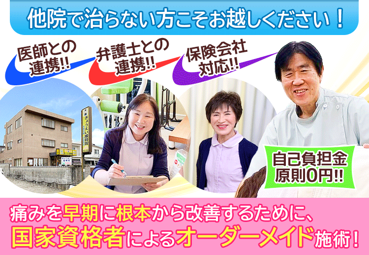 なお、接骨院の中には、必要以上に施術をおこない、保険会社などとトラブルを起こすところもあるようですが、当院では、交通事故に詳しい弁護士の指導のもと、適切な施術をするように努めておりますので、安心して通院していただけます。